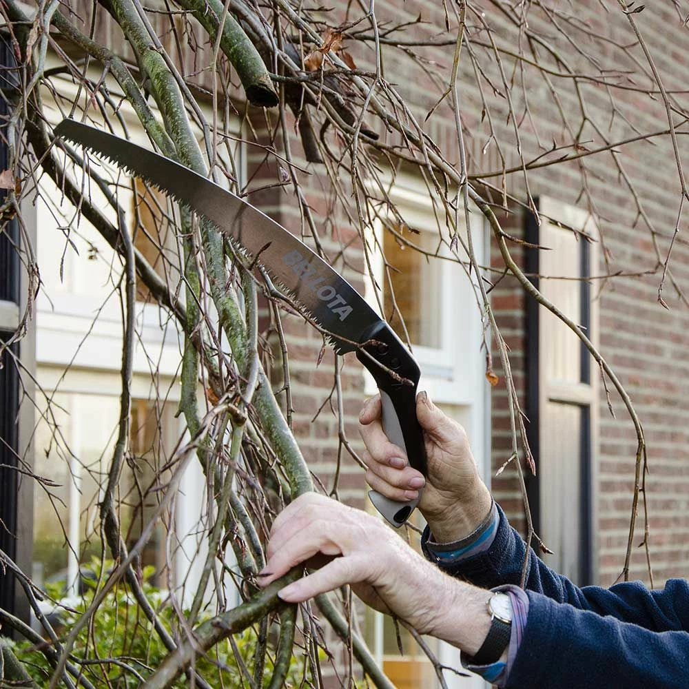 Gebogene Astsäge mit 33 cm langem Sägeblatt. Dank des gebogenen, konischen Sägeblatts mit impulsgehärteten Sägezähnen tritt zwischen Holz und Säge weniger Reibung auf. Auch gelingt das Sägen leichter und schneller. Mit einem Handgriff aus Polypropylen und Gummi, für den optimalen Griff beim Sägen.