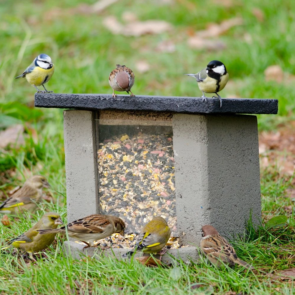 Diese Futterstation, gefertigt aus solidem Holzbeton-Material, wurde speziell für Vögel entwickelt, die überwiegend ihre Nahrung auf dem Boden suchen, wie Amseln, Rotkehlchen, Finken und Sperlinge. Garantiert ein Produkt von langer Lebensdauer und außerdem bequem zu säubern.