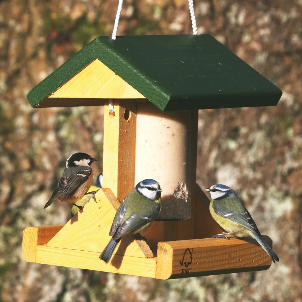 Dieses schlichte Futterhaus aus Holz ermöglicht es insbesondere kleinen Vögeln, auf dem Rand der Futterstelle in aller Ruhe ihre Mahlzeit zu genießen. Das Haus ist für Energiekuchen mit einer Größe von 500 ml geeignet und ist mit einer Aufhängeschlinge versehen.