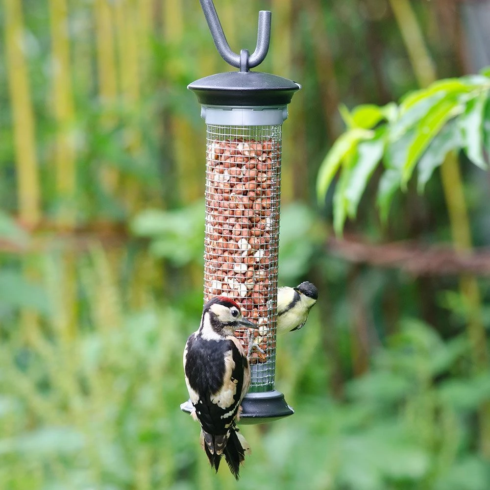 Mit einem Durchmesser von gut 8 cm fasst die Apollo eine extra große Menge Erdnüsse. Zudem haben wir bei der Maschenbreite des Drahtgeflechts darauf geachtet, dass die Vögel keine ganzen Erdnüsse mitnehmen können. Die kleinen Stückchen, die sie aus der Erdnuss-Säule Apollo herauspicken, sind auch für junge Vögel ungefährlich.