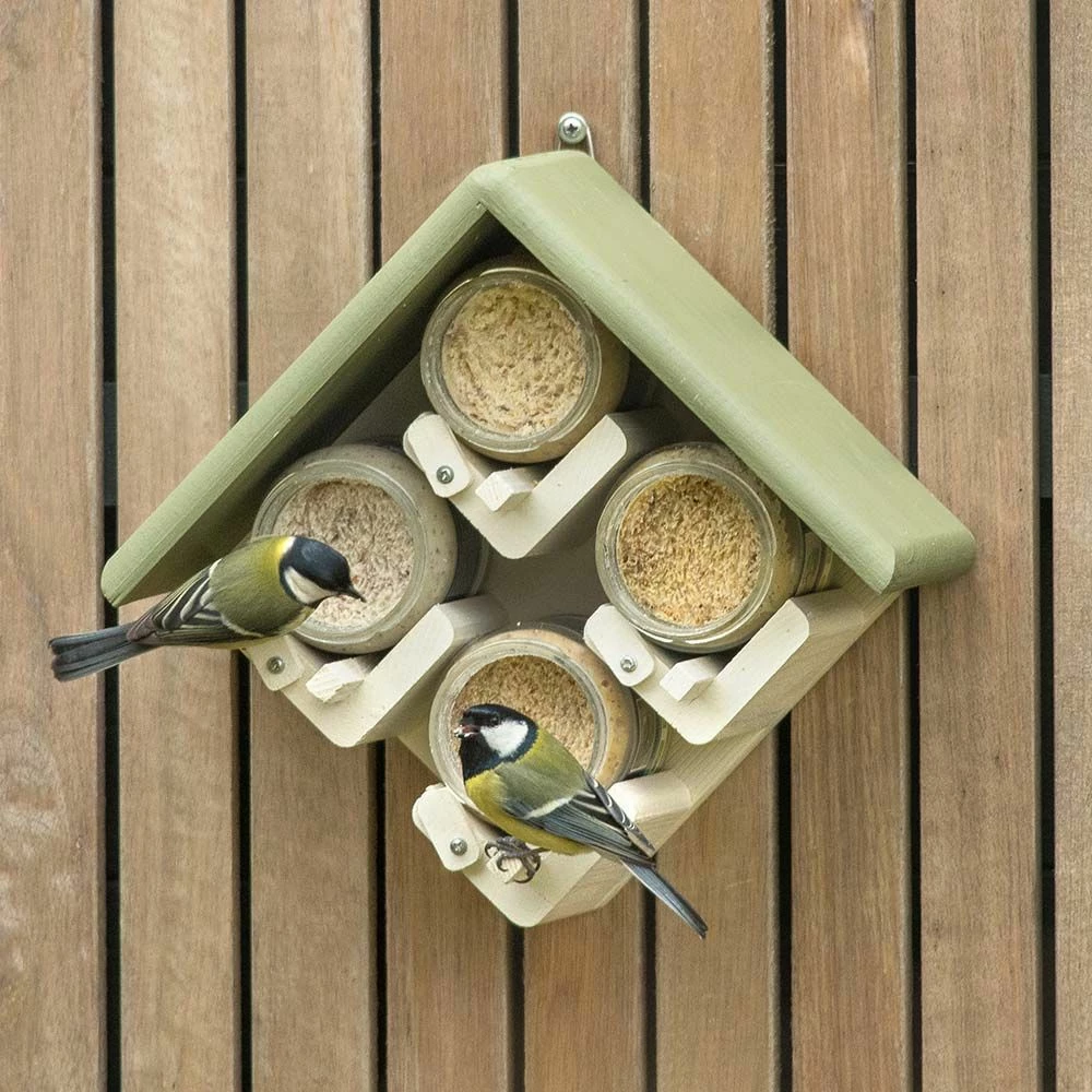 Vögel lieben Gartenvögel-Erdnussbutter. Mit dem Erdnussbutterglas-Halter „Freiburg“ aus Holz können Sie direkt vier Gläser zugleich anbieten. So können Sie zum Beispiel auch testen, welche Sorte Gartenvogel-Erdnussbutter bei Ihren Gartenvögeln am besten ankommt.
