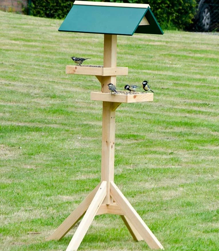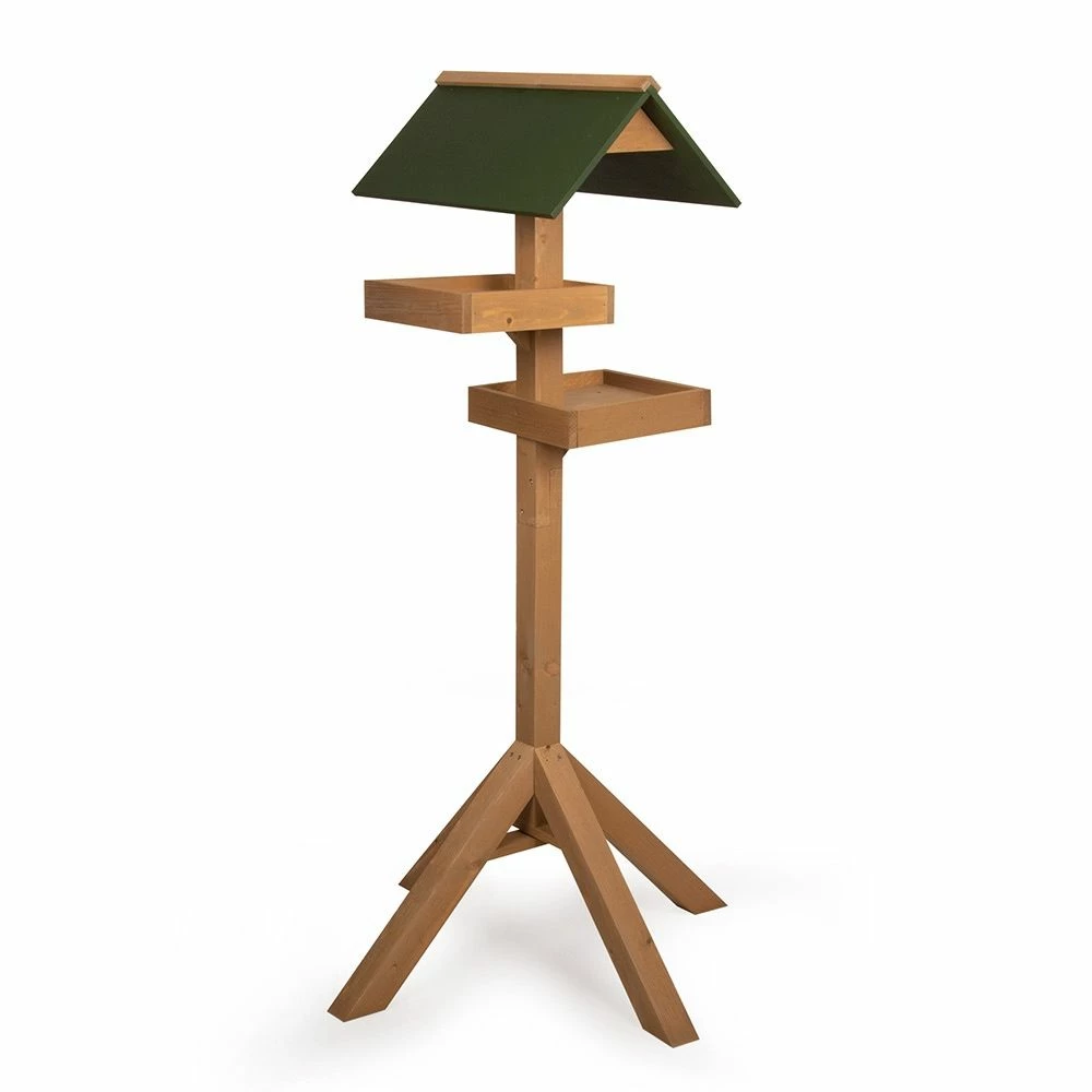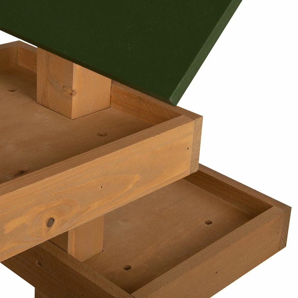 Das Vogelfutterhaus „Astoria“ zeichnet sich durch seine zwei separaten Futtertische aus, auf denen Sie unterschiedliche Futtersorten zugleich anbieten können. Natürlich bieten die zwei Tische auch vielen Vögeln gleichzeitig die Möglichkeit, an der Futterstelle fressen zu können. Das grüne, spitze Dach schützt das Futter bei Regenwetter und Schneefall. Dieses stehende Futterhaus ist in natürlichen, traditionellen Farben gehalten.