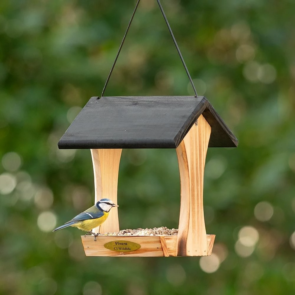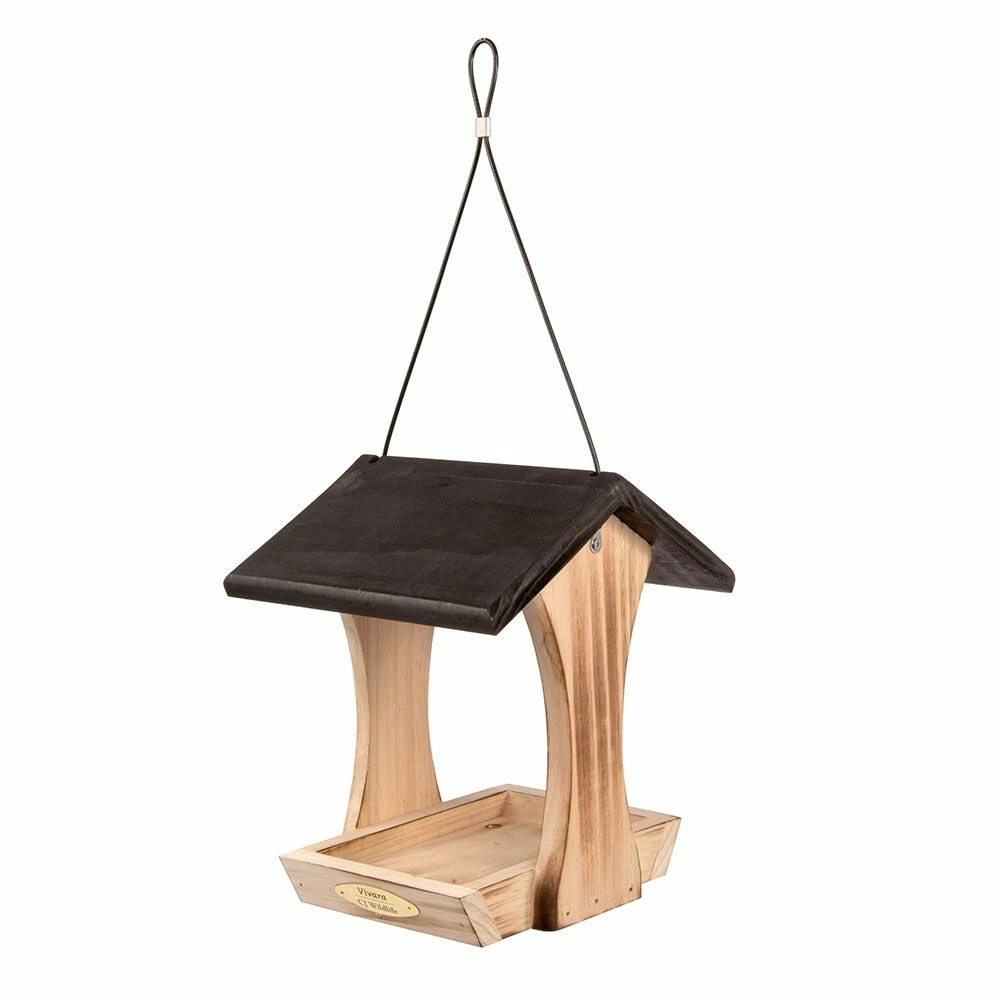 Das hängende Vogelfutterhaus „Conneticut“ besticht optisch durch das schwarze Dach in Kombination mit geflämmten Holz. Trotz des modernen Designs fügt es sich jedoch auch gut in naturnahe Gärten ein.