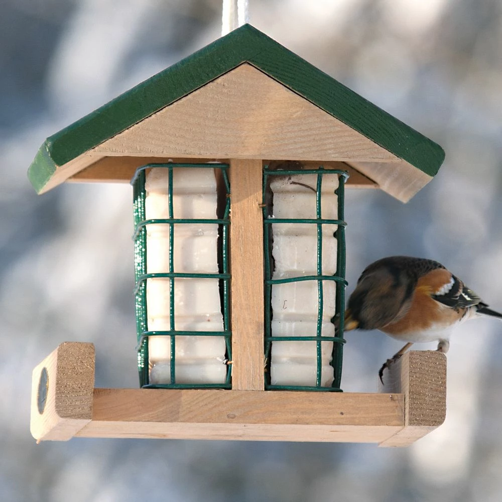 Dieses solide Futterhaus aus Holz bietet die Möglichkeit, zwei Futterblöcke gleichzeitig anzubieten. Das Futterhaus ist mit einer praktischen Aufhängeschlinge versehen, so dass Sie es sofort an einer geeigneten Stelle aufhängen können.