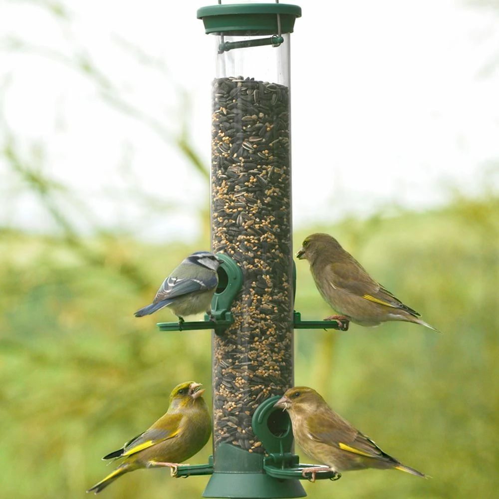 Futtersäulen sind äußerst stabil und haben eine lange Lebensdauer. Die durchsichtigen Futterröhren sind aus UV-beständigem Polycarbonat hergestellt und wurden auf Wetterfestigkeit geprüft, um sämtlichen Witterungsumständen dauerhaft standhalten zu können. Ein großer Vorteil dieser Futtersäulen liegt in der natürlichen Sitzhaltung der Vögel bei der Futteraufnahme: mit dem Kopf nach vorne. Die vier Futteröffnungen dieser Säule sind nämlich mit einem Sitzring versehen. Ein einzigartiges und zugleich einfaches System, das außerordentlich zweckmäßig ist.