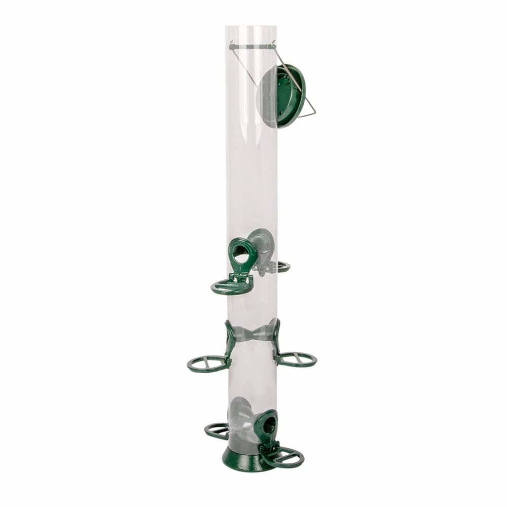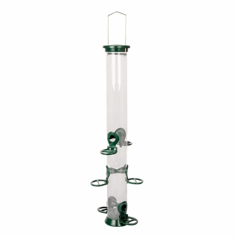 Futtersäulen sind äußerst stabil und haben eine lange Lebensdauer. Die durchsichtigen Futterröhren sind aus UV-beständigem Polycarbonat hergestellt und wurden auf Wetterfestigkeit geprüft, um sämtlichen Witterungsumständen standhalten zu können. Ein großer Vorteil dieser Futtersäulen liegt in der natürlichen Sitzhaltung der Vögel bei der Futteraufnahme: mit dem Kopf nach vorne. Die sechs Futteröffnungen dieser Säule sind nämlich mit einem Sitzring versehen. Ein einzigartiges und zugleich einfaches System, das außerordentlich zweckmäßig ist.