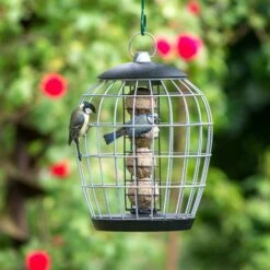 Das Metallsystem ist pulverbeschichtet. Dadurch haben Sie garantiert viele Jahre Freude an diesem Meisenknödelhalter mit Schutzkäfig. Hängen Sie dieses attraktive Futtersystem an einen Baum oder ein Futterpfahlsystem und erfreuen Sie sich an den Vögeln, die in Scharen kommen werden.