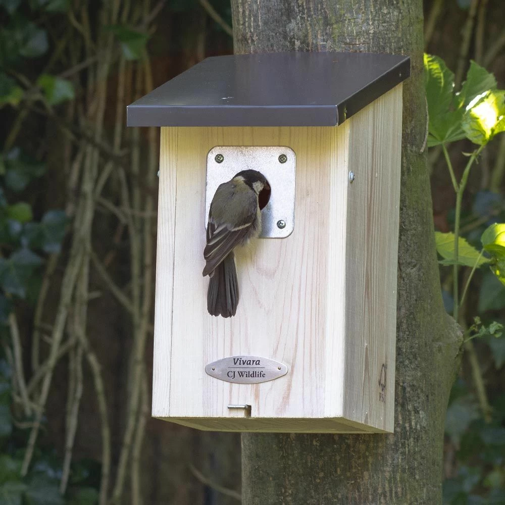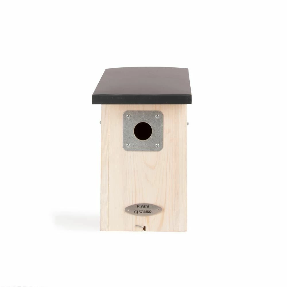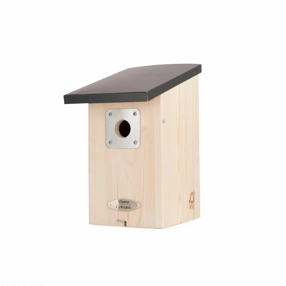 Der „Fairbanks“ ist ein geräumiger Nistkasten. Mit einer Einflugöffnung von 32 mm eignet sich dieser Nistkasten vor allem für Kohl- und Haubenmeisen. Das Holzdach ist mit einer Metallplatte verkleidet, die dem Nistkasten eine moderne Ausstrahlung verleiht. Das Holz unter der Metallplatte verhindert, dass die Temperatur im Nistkasten unnötig ansteigt.