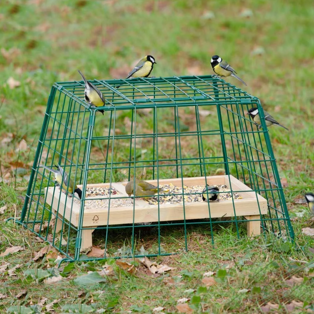 Schützen Sie kleine Bodenfresser mit dem Schutzkäfig „Maxi“. Einfach diesen pulverbeschichteten Schutzkäfig aus Metall über den Futtertisch stellen, und die Vögel können in aller Ruhe fressen: Weder Katzen noch andere große Störenfriede haben eine Chance. Die Durchflugöffnungen sind 6 cm breit und 6,5 cm groß – so passen Amseln noch durch die Öffnungen, Katzen und die meisten Rabenvögel jedoch nicht. (Hinweis: Es kann jedoch vorkommen, dass kleinere Rabenvögel hindurchpassen; soll dies vermieden werden, empfehlen wir den Schutzkäfig „Midi“. ).